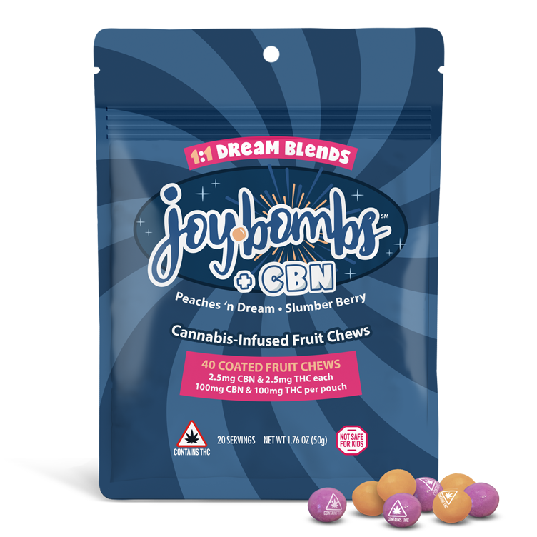 Joy Bombs + CBN 1:1 Dream Blends come in a sweet mix of two deliciously snoozy fruit flavors: Peaches ’n Dream and Slumber Berry, each with a CBN boost!!